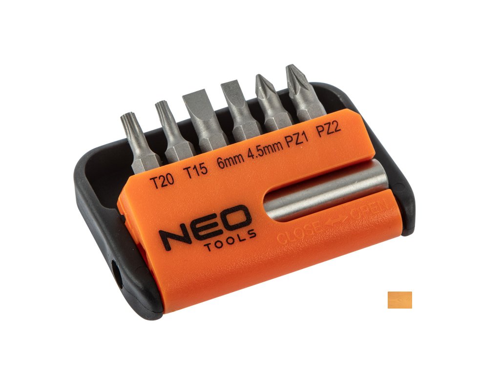 Šroubovací bity s rukojetí, sada 7 ks, rukojeť 1/4, 60 mm, magnetická, 6 ks šroubovacích bitů 25 mm, ocel S2, velikosti: ploché 4.5, 6 mm, křížové PZ1, PZ2, Torx T15, T20, plastové pouzdro, certifikát TÜV Sada šroubovacích koncovek NEO 1/4" obsahující 7 dílů. Tvrdost bitů dosahuje v důsledku použití legované oceli S2 hodnotu 60 HRC, což výrazně prodlužuje jejich životnost a zvyšuje kvalitu práce. Sada obsahuje 6 standardních šroubovacích bitů s délkou 25 mm. Bity mají magnetické hroty. Sadu doplňuje rukojeť 60 mm. Zárukou vysoké kvality a spolehlivosti produktu je certifikát TÜV Rheinland. Značka NEO splňuje očekávání profesionálů.ocel SUPER HARD 1 ks nástavec na bity 6bitů: plochý: 4,5,6mm křížový: PH1,PH2 Torx: T15, T20