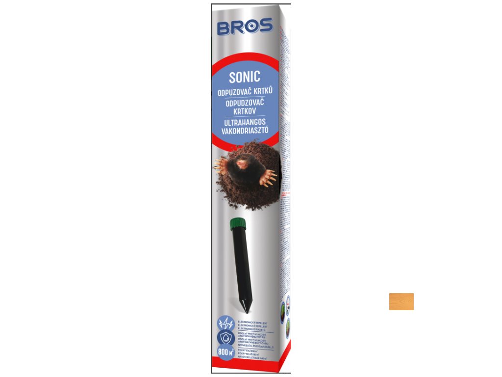 Elektrický odpuzovač účinkuje na krtky, hraboše a jiné hlodavce. Je šetrný vůči životnímu prostředí a nevyžaduje použití chemikálií. Vysílá zvukové signály na frekvenci 400 Hz, čímž odpuzuje hlodavce, které mají dokonalý sluch a schopnost cítit vibrace. V závislosti na typu půdy působí na ploše 500 - 600 m2. Odpuzovač je možné použít na trávnících, květinových záhoncích, rekreačních oblastech, sportovních plochách a hřištích, na zahradách či ve fóliovníku. Balení je účinné po mnoho měsíců bez ohledu na roční období a povětrnostní podmínky. Návod k použití: odšroubujte víčko a vyjměte rám umístěný uvnitř. Umístěte baterie podle obrázku a vložte zpět do přístroje. Zašroubujte víčko (díky těsnění je plašič odolný proti působení vlhkosti) a umístěte plašič do středu plochy, kterou chcete ochránit. Výměnu baterií lze provést bez nutnosti vytahování přístroje ze země