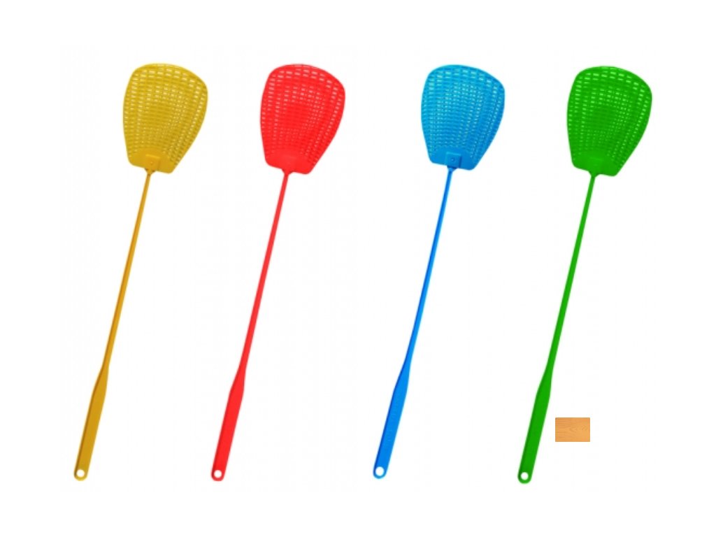 Praktická plácačka na mouchy v barvě žluté, červené, modré a zelené.