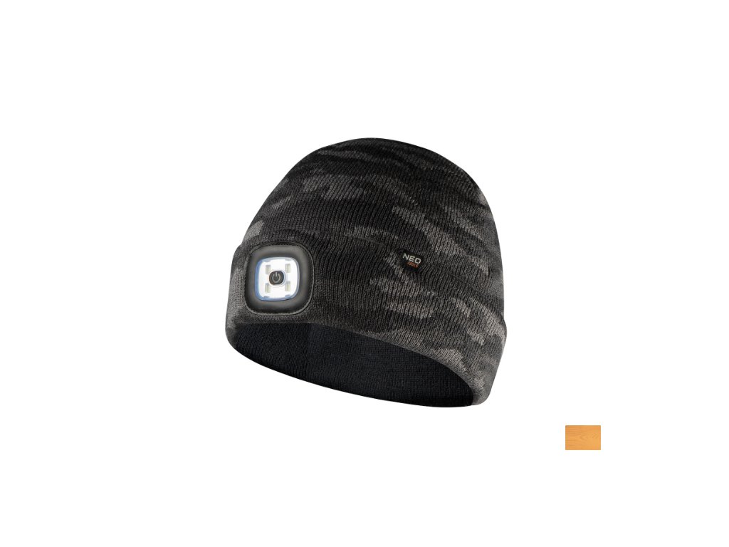 Dvouvrstvá čepice s LED svítilnou, CAMO URBAN, složení 100% akryl, svítilna s max. 180 lumeny, LED svítilna s regulací intenzity (100%, 75%, 50%), svítilna s vestavěným akumulátorem a USB zásuvkou pro nabíjení, voděodolná (IP43 - ochrana proti postříkání vodou pod libovolným úhlem do 60° od svislice na každé straně), jedinečný maskovací vzor se vztahuje k řadě CAMO URBAN, certifikát CE