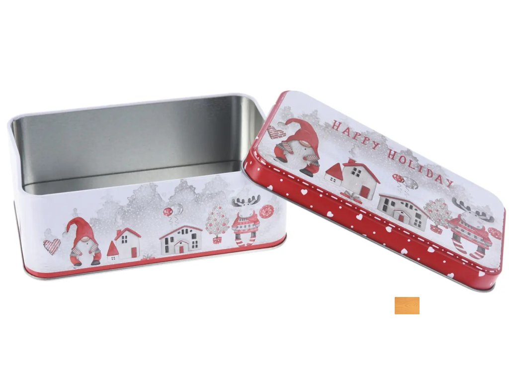 Plechová obdélníková dóza 16 x 10 x 6 cm, VÁNOČNÍ dekor rozměry: 16 x 10 x 6 cm materiál: plech Vánoční dóza na uschování a uskladnění potravin, pomůže zachovat jejich nejvyšší kvalitu, chuť i aroma.