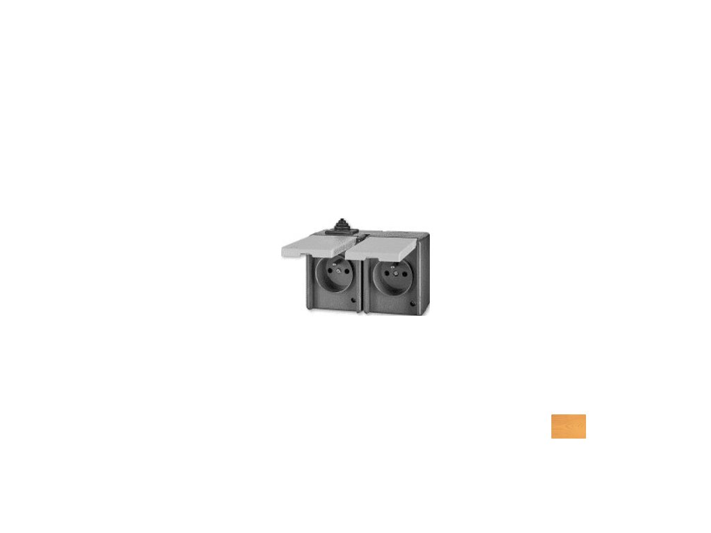 Venkovní dvojzásuvka vodotěsná ABB PRAKTIK 5518-2029 S šedé barvy s montáží na zeď a krytím IP 44 pro venkovní použití.