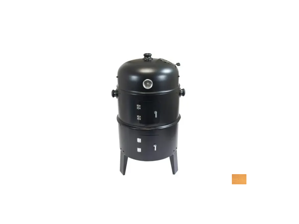Dvě části mají dvířka pro přikládání a kontrolu ohně, vrchní část teploměr do 300 st. C, 2 tyče pro zavěšení uzených pokrmů a otvor pro vypouštění kouře.