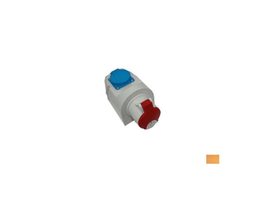 Venkovní zásuvka na zeď IZVZ 1643 pro napětí 400V + 230V s krytím IP 44. Červená zásuvka na 400 V se 4 vodiči a krycím víčkem pro maximální jmenovitý proud 16 A, přidána modrá zásuvka na 230 V.