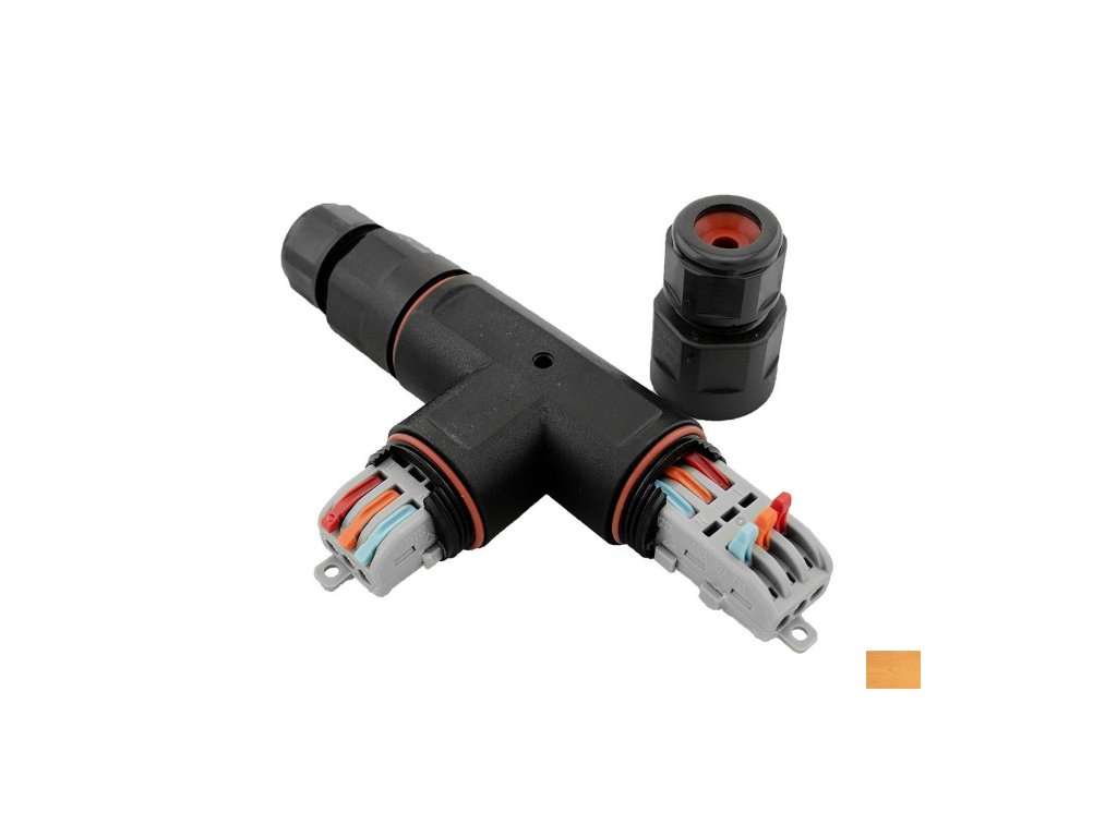 Kabelová bezšroubová spojka/odbočka FK technics FK-T3P-IP68 má funkci rozbočky ve tvaru „T“ a je určena pro připojení 3 vodičů o průřezu 0,75 - 2,5 mm2 a průměr odbočného kabelu 3 – 10 mm. Je voděodolná, nabízí stupeň krytí IP68.