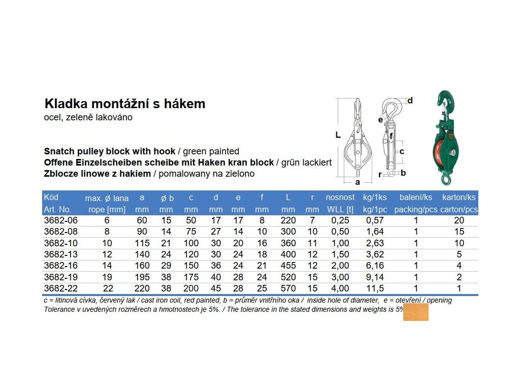 Kladka montážní s hákem je určena pro textilní či ocelová lana. Je určena do těžkých provozů. Kladka má kluzné ložisko. Pro pohodlnější opevnění má kladka odklápěcí bočnice. Bočnice jsou z lakovaného plechu. Hák a rolna je ze zušlechtěné ocele.