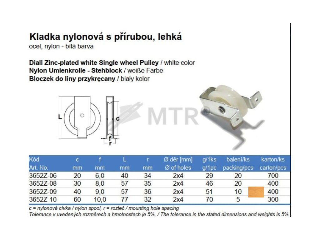 Kladka nylonová s přírubou - jedná se o lehkou kladku, jejíž příruba je pozinkovaná. Nylonová kladka je bílá.