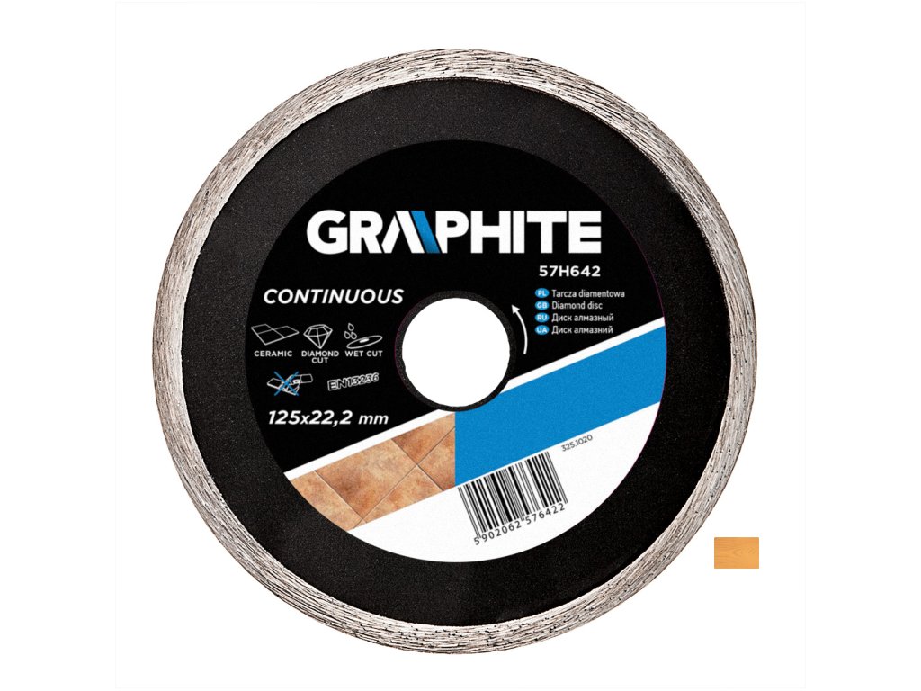 Plný diamantový kotouč GRAPHITE je díky celoobvodovému segmentu lisovanému za horka vhodný k vykonávání těžkých stavebních prací. Vysoce odolný celoobvodový diamantový segment umožňuje účinné řezání keramických prvků, ale také terakotové a kameninové dlaždice, žulu nebo mramor.