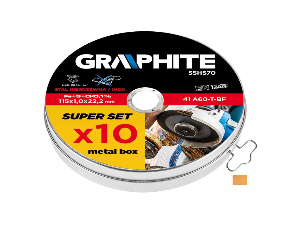 Kotouče na řezání kovu GRAPHITE (ref. č. 55H570) s vnějším průměrem 115 mm umožňují díky pokročilé konstrukci a omezení tloušťky významně zkrátit dobu řezání. Jsou určeny hlavně k řezání nerezové oceli díky omezenému obsahu síry, chloru a železa. Zaručuje vysokou úroveň bezpečnosti práce díky shodě produktu s normou EN12413.