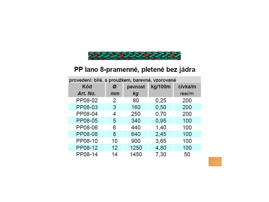PP lano 8mi pramenné, pletené bez jádra, je odolné vůči UV záření, chemikáliím, plavou na vodě, výborná oděruvzdornost, nízká tažnost. Použití v zemědělství na stavbě, zahradě atd.V rozměrové řadě 2mm -16mm.