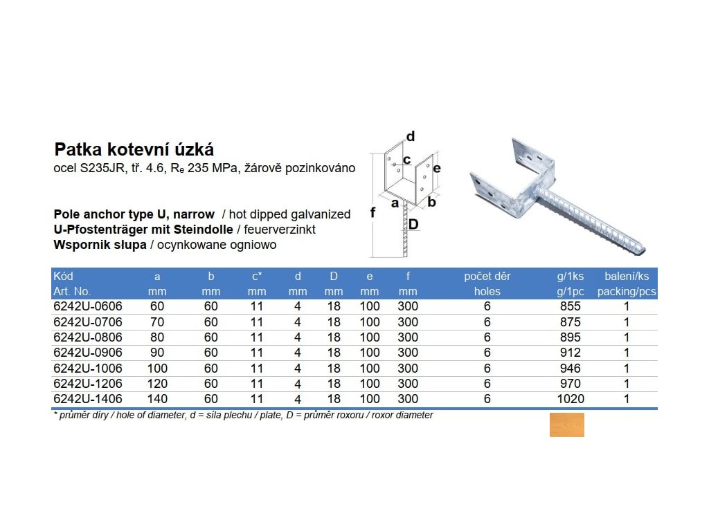 Patka kotevní ve tvaru U (úzká pásovina) je k dispozici v 7 velikostí, v rozměrové řadě 70x60mm – 140x60mm, v povrchové úpravě: žárový zinek.