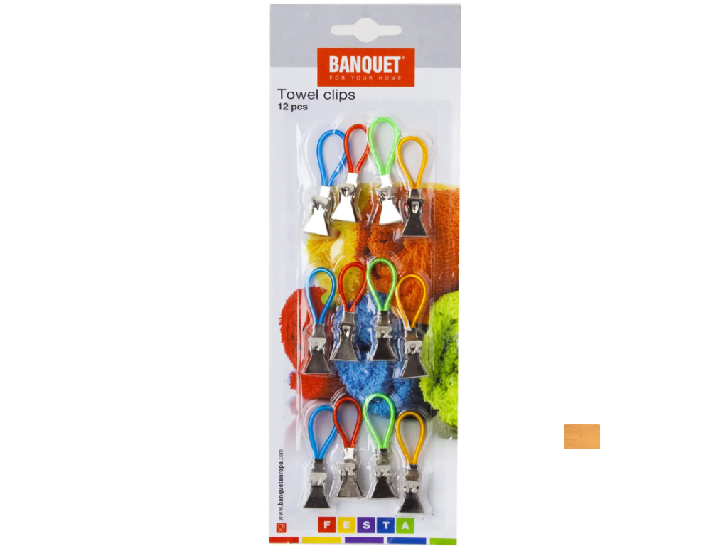 Poutko na utěrky kov. (12 ks).materiál: kovmix barevbalení: 12 ksKlipsy na utěrky / ručníky ACCASA.Poutka slouží k zavěšení utěrek a ručníků a jsou dodávány v mixu barev.