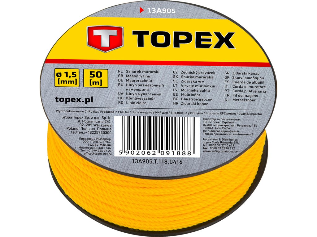 Zednický provázek TOPEX nachází uplatnění v stavebnictví. Používá se k určování přímých linií, zejména při zdění a malování. Cívka z plastu. Silný pletený provaz, odolný proti roztržení. Značka TOPEX je určena pro domácí kutily.