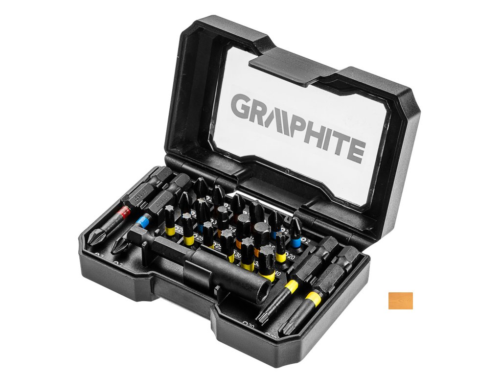 Malá kompaktní sada nástavců GRAPHITE (ref. č. 56H612). Zúžené bity ohýbáním omezují sílu dotažení – chrání před stržením závitu šroubu.