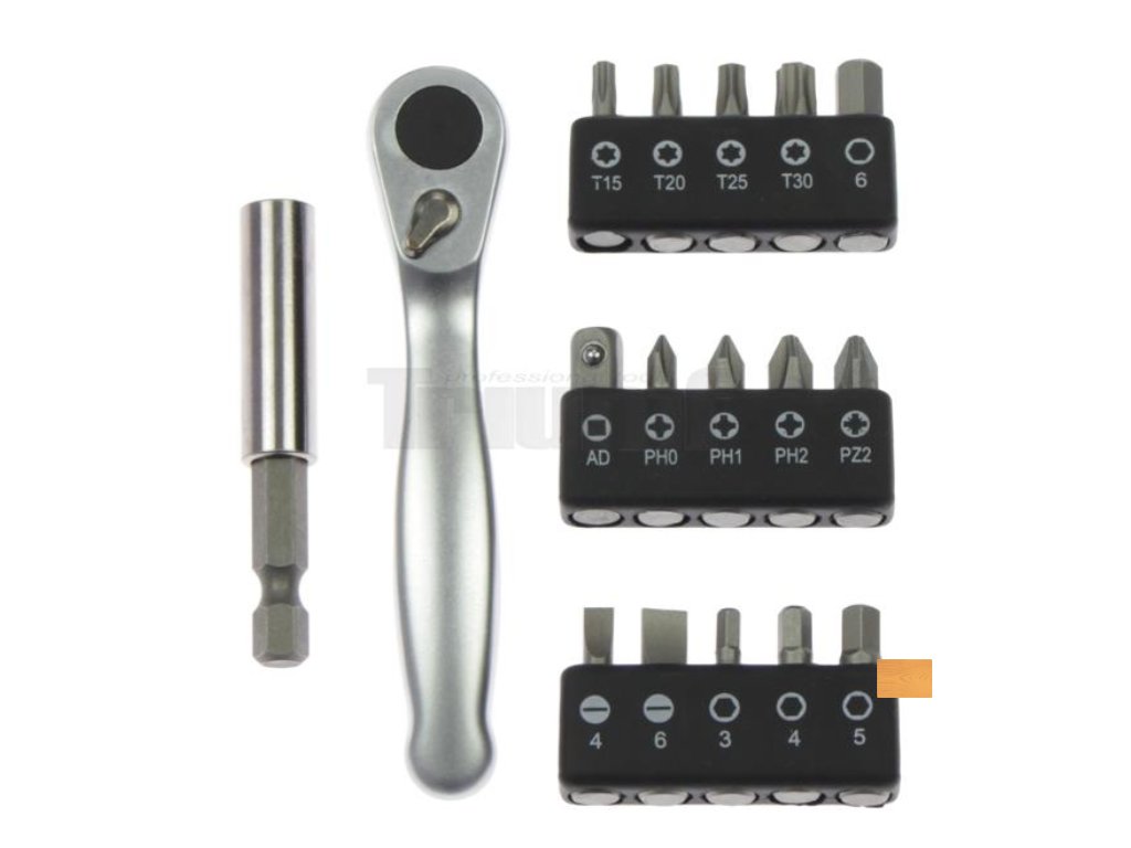 - Sada bitů s ráčnou je určena pro profesionální i hobby použití na šroubování šroubů a vrutů s různou velikostí a tvarem hlavy. Sada obsahuje nejčastěji používané rozměry a tvary bitů.