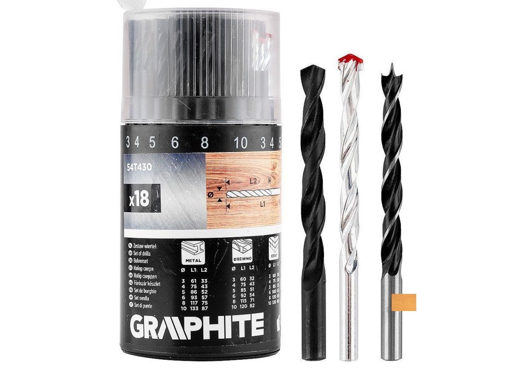 Sada vrtáků do kovu, dřeva a cihel: 3, 4, 5, 6, 8, 10 mm, 18 kusů 54T430 od GRAPHITE je sada 18 kusů vrtáků do kovu, dřeva a cihel. Vrtáky se vyznačují svými průměry: 3, 4, 5, 6, 8 a 10 mm. Jsou opatřeny válcovou stopkou. Vrtáky do kovu jsou navíc naostřeny pod úhlem 118°. Tato sada od značky GRAPHITE bude vhodným doplňkem výbavy každého domácího kutila.