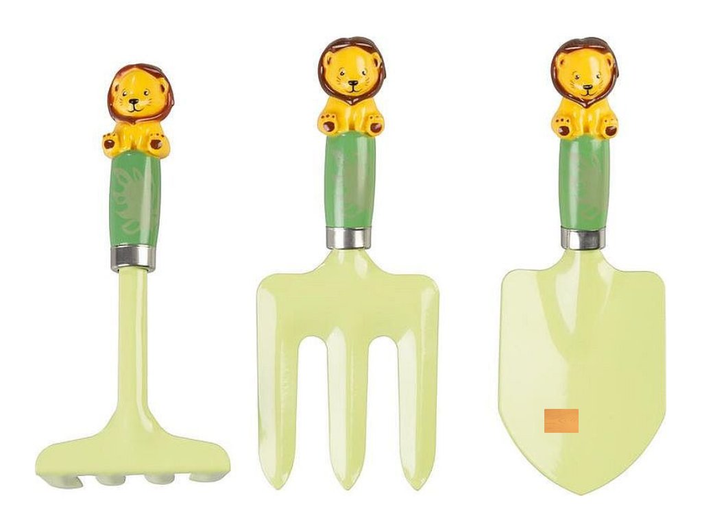 3-dílná sada obsahuje lopatku, hrábě a vidle, základní nástroje přizpůsobené pro dětské ruce, což umožňuje dětem aktivně se podílet na zahradních pracích.