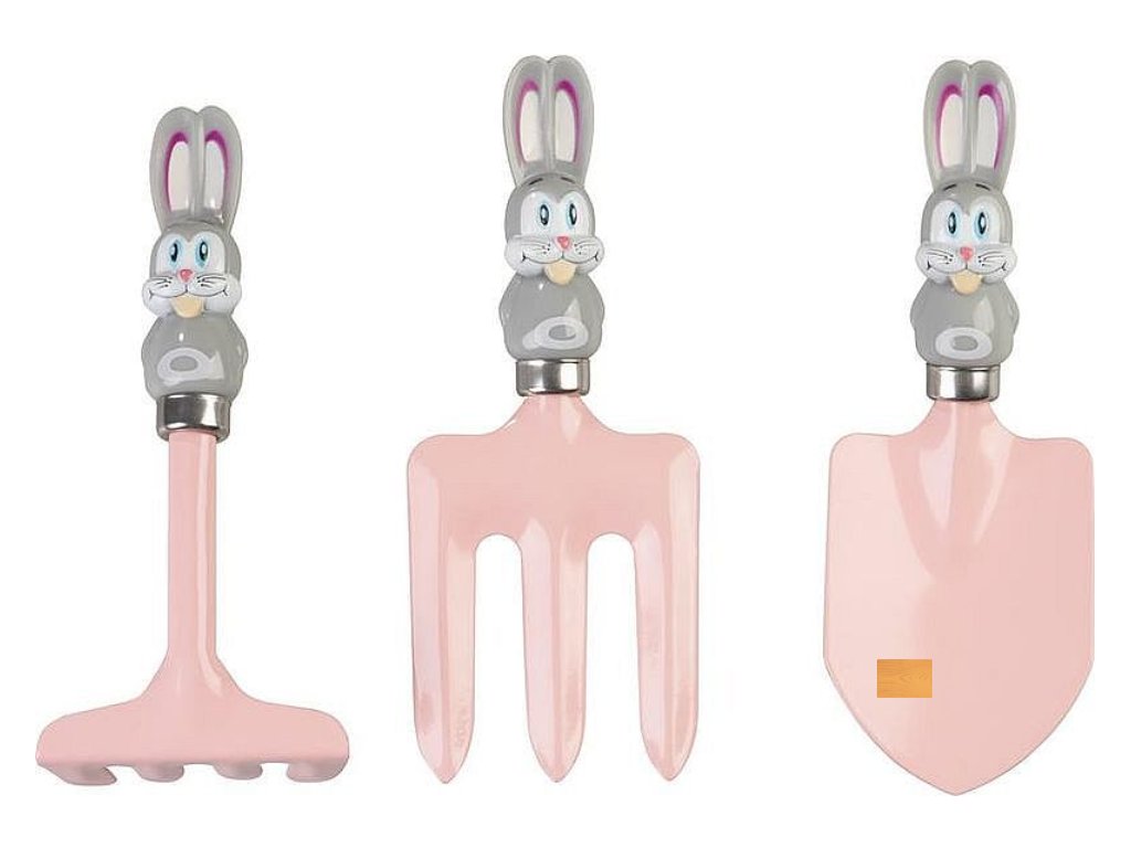 3-dílná sada obsahuje lopatku, hrábě a vidle, základní nástroje přizpůsobené pro dětské ruce, což umožňuje dětem aktivně se podílet na zahradních pracích.