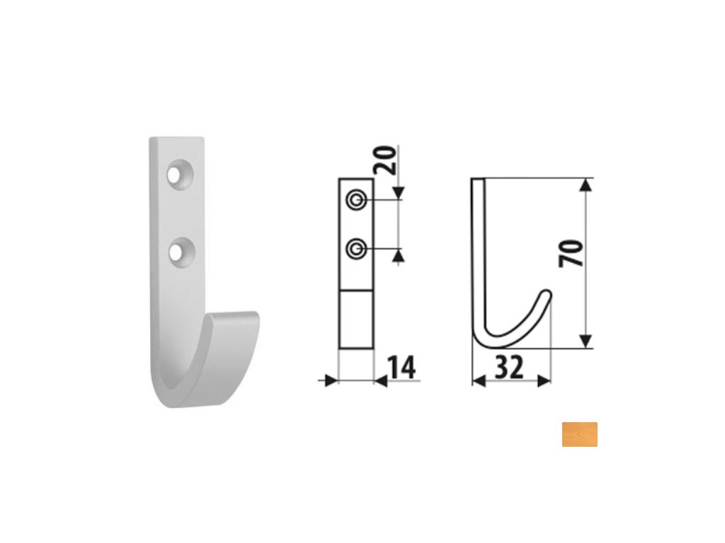 Celokovový šatní věšák z povrchově upravené slitiny hliníku, k přišroubování na stěnu, dodávaný včetně vrutů.Rozměry: d.32 š.14 v.70 r.25 mm