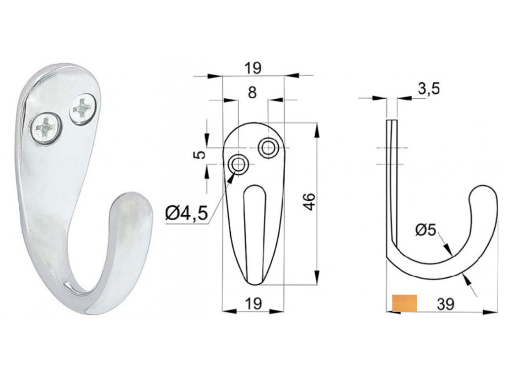 Celokovový šatní jednověšák z galvanicky pokovené či lakované slitiny zinku, k přišroubování na stěnu, dodávaný včetně vrutů.
