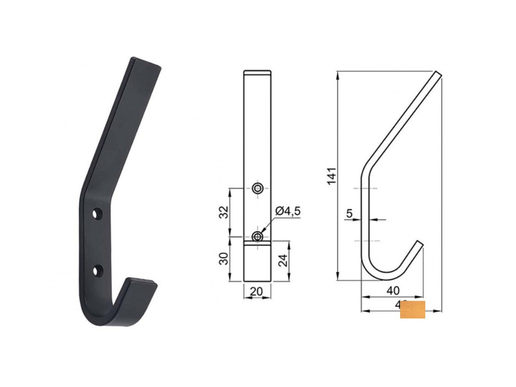 Celokovový šatní věšák se dvěma háčky z komaxitováním povrchově upravené slitiny hliníku, k přišroubování na stěnu pomocí dvou otvorů pr.5mm, dodávaný včetně vru