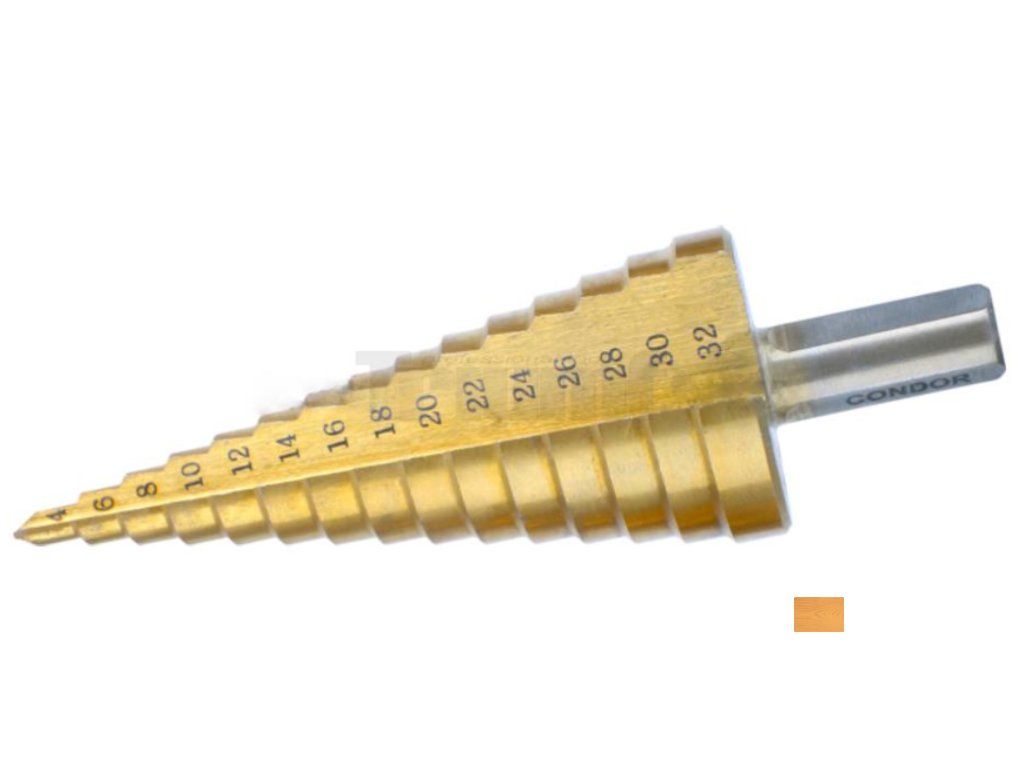 - Vrták stupňovitý je vyroben z HSS oceli. Povrch je opatřen tvrdým Titannitridovým povlakem pro lepší vrtací vlastnosti a delší životnost vrtáku. Stopka vrtáku je opatřena třemi ploškami, proti protočení ve sklíčidle. Vhodné použití pro vrtání měkkých kovů (železo, zinek, mosaz, měď) a plastů s tloušťkou max. 4 mm. Rovnoměrným přítlakem a menšími otáčkami předejdete k poškození vrtáku a tím pádem prodloužíte jeho životnost.