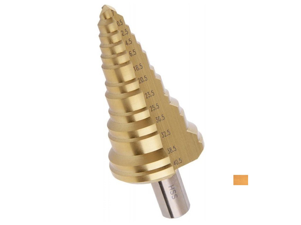 Dílenský stupňovitý vrták pro běžné vrtání do kovu.
