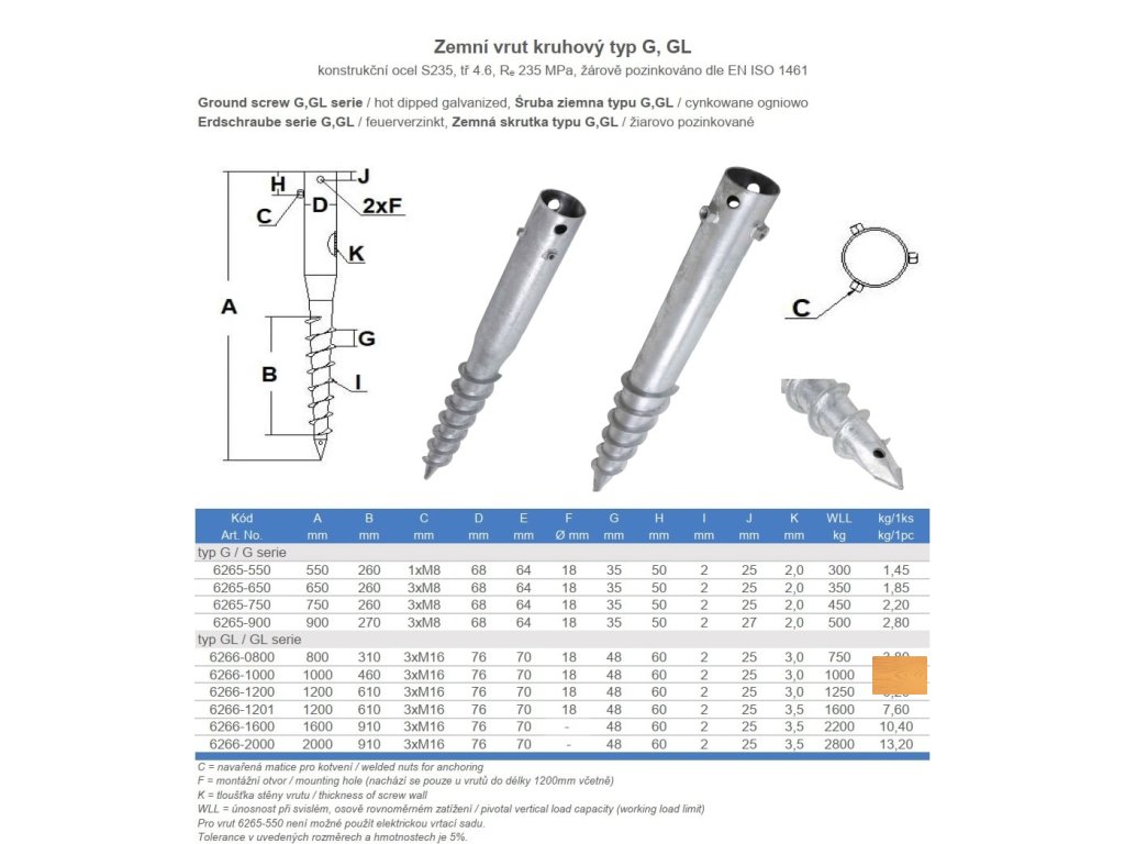 Zemní vrut MTR® typ G je k dispozici ve 4 velikostech (průměr kotveného prvku 25 – 65 mm, délka vrutu 550-900mm) v povrchové úpravě žárový zinek. Jedná se o zemní vrut s kruhovým otvorem 68mm, s navařenými maticemi M8. Pro tento vrut je vhodné použít šroub M8 x 40mm (délka šroubu bez hlavy). Je vhodný pro kotvení plotových sloupků a zahradního vybavení. Konstrukční prvek je do vrutu ukotven pomocí ostrohranného štěrku (granulátu). Zemní vruty série G je možné kombinovat s příslušenstvím. Redukce umožní skrytou montáž do hranolů a trámů, plastová redukce instalaci prvků menších průměrů. Ploché víko slouží ke kotvení dřevěného roštu (hranolu, trámu, desky či prkna) menších dřevostaveb. Zemní vruty se do země instalují zašroubováním pomocí montážní tyče, instalačního kříže nebo elektrické vrtačky s příslušnou redukcí, které si u nás můžete koupit nebo zapůjčit. Pro vrut 6265-550 není možné použít elektrickou montážní vrtací sadu.
