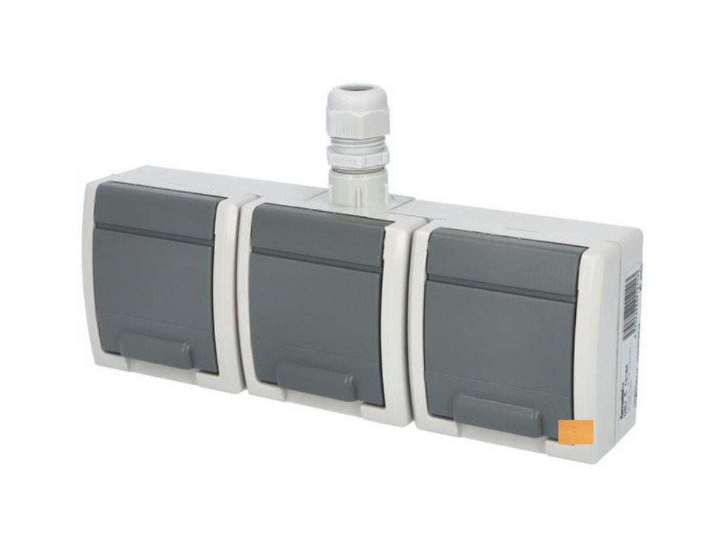 ATLAS 19184 IP65 Zásuvka 3x 2P+PE, 3-násobná vodorovná s vývodkou M20, na povrch, šedá. Provedení v šedé barvě RAL 7035 a ovládacím prvkem v barvě RAL 7043. Rozteč kotvících bodů (výška x šířka ): 61x203mm.